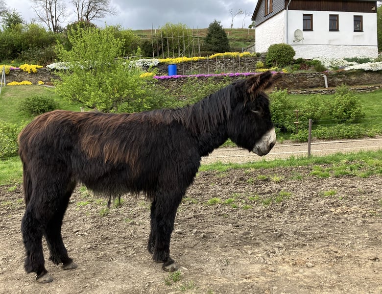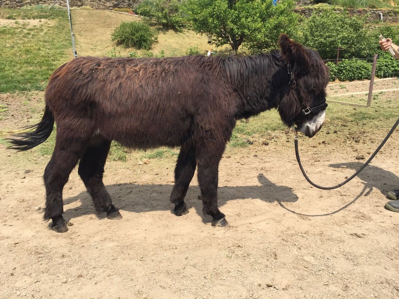 Kompass ist ein sehr lieber, menschenbezogener Großesel mit französischen Papieren. Er hat einen großen Fundus an Erfahrung im Umgang mit Menschen mit Beeinträchtigungen und an Wanderungen in jedem Gelände. Er ist gelassen und selbstsicher, verträgt sich gut mit seinen Eselfreunden, liebt Kinder und lebt in der Herde. Er hat Gras und Heu zur freien Verfügung und überfrisst sich nicht. Er lässt sich überall sehr gern anfassen und putzen, ist absolut schmiedefromm, kennt Elektrozäune, Hunde, Katzen, HJühner, Pferde und Rinder. Kompass ist ein Esel, der den engen Kontakt zu seinem Menschen sucht und braucht, ein absoluter Verlassesel auf der Weide und unterwegs.