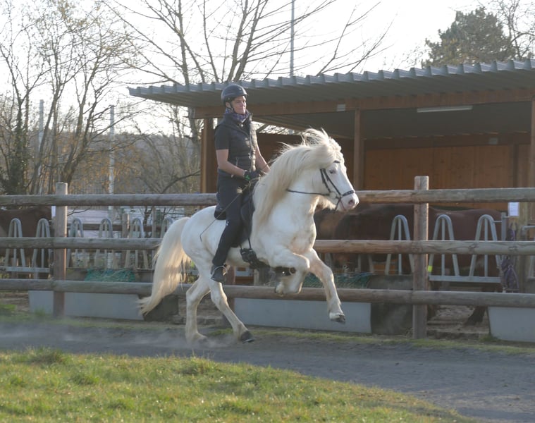 Cette jeune étoile filante est disponible pour les juments étrangères dans le bassin de pâturage pour l’été 2024 ! Lieu : Blankenheim ! Fannar est un fils né en 2020 de notre père W8 avec une licence d’élite Pegasus vom Recherbusch. Il porte également le W8 White Spotting Gen, dans son cas dans la combinaison spéciale avec le Spash Gene. Fannar est ce qu’on appelle un blanc maximal, une énorme tache blanche à carreaux, pour ainsi dire. Il n’est pas porteur d’un gène crème. Cependant, la couleur n’est que la cerise sur le gâteau de ce jeune homme : en course libre, il montre beaucoup de tölt naturel lâche et de très bonnes phases de dépassement. Le galop est énergique et avec un bon mouvement en montée. Trot montre Fannar élastique et élastique avec beaucoup de vitesse. Au sol, d’une part, il est très calme et imperturbable, d’autre part, il réagit avec agilité et enthousiasme aux aides à la conduite. Fannar a un pedigree passionnant : du côté de son père, il peut être retracé jusqu’au multiple participant aux Championnats du Monde Svartur vom Hochwald (FIZO 8.09) et au meilleur étalon et lauréat du prix d’honneur pour la progéniture Keilir frá Miðsitju (FIZO 8.63). Sa mère, Freisting von Kastali, est elle-même FIZO-Elite (conformation : 8.16 - caractéristiques de conduite 8.12 - total 8.14) et descend du talent de passage Djáknar frá Hvammi (FIZO 8.46, premier prix pour la progéniture). Freisting est une jument très sympathique qui aime courir : à partir d’un passage de course rapide, vous pouvez la parer sur quelques mètres dans une marche détendue sur la longue rêne. Ses cinq allures sont uniformément réparties, sûres et avec des mouvements larges. Évaluation FEIF des poulains 2020 : Extérieur : 8.1 - Intérieur : 8.3 - Vitesse : 8.2 - Total : 8.19 Discours de fin d’année : « Poulain à cinq allures bien développé, droit, sur longues pattes, expressif, avec de très bonnes réactions, a montré un très bon tölt avec beaucoup de débit et dans l’ensemble une très bonne répartition de la démarche et de bons mouvements. » Cette année, en prévente, toujours pour 750€, mais en 2024 au prix de 850€.