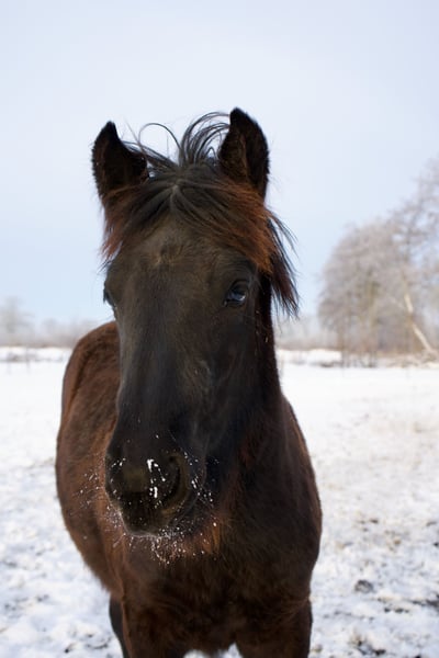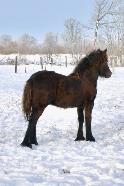 Karsten is a black pony with a few white hairs under his forelock. He has a nice conformation and stands approximately 138 cm tall. He is registered with the Dutch Fell Pony Studbook. Karsten is curious, playful, and learns quickly.