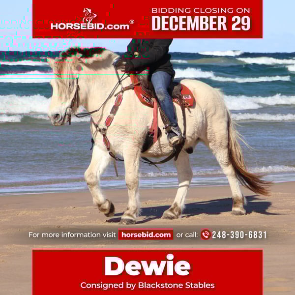 ⚜️ 𝓗𝓮𝓻𝓲𝓽𝓪𝓰𝓮 𝐖𝐢𝐧𝐭𝐞𝐫 𝓒𝓵𝓪𝓼𝓼𝓲𝓬⚜️ Happening now thru MONDAY | DECEMBER 29th - Available EXCLUSIVELY on HorseBid's website! For more details and to register visit: www.Horsebid.com CONSIGNOR CONTACT: Blackstone Stables 248-390-6831 LOCATION: Howell, MI BREED: Norwegian Fjord REGISTERED: Yes REGISTERED NAME: JE-NEA-AL COLOR: White Dun HEIGHT: 14.1 AGE: 8 GENDER: Gelding I couldn’t be more excited to introduce you to JE-NEA-AL. He is a registered Norwegian Fjord (17-7262-S) gelding. We call him Dewie around the farm. He is 8 years old. Dewie is brilliantly bred out of imported stock. He is a very rare white dun in color, who Carrie's the silver gene. If you could picture your favorite squishmellow coming to life Dewie would be it. He has a comforting nature while being exceptionally huggable. He stands 14.1hh. If you know about the breed you know they are known for their quiet demeanor, versatility and strong conformation. Dewie is no exception to that. He is beautifully put together and is hands down the most versatile guy around. Dewie is loaded with personality, and it oozes out of him! He adores people. He know liberty work such as how to lay down, and can even open a can of Mt. Dew, which happens to be his favorite drink. Dewie has been ridden on the roads, fields, the shore line of Lake Michigan and in the arena. He’s been used to round up cattle and rope off of. He will ride 100% off of your seat and leg ques. He will take care of any rider in any situation. We have had him out on the trails in the water and woods, he takes the lead or follow behind. He will ride out alone as well. He has absolutely delightful gaits. This boy makes you feel like a professional every ride. He has had kids as young as 5 years old ride him independently. He is soft in the bit and responsive to all aids. Dewie has all the natural horsemanship training you would ever expect and he soaks it all up like a sponge. He rides English, western, bareback and has had 30 days in harness. He has been to town, he’s been camping, he’s been on hunter paces and cattle drives, and even sledding! He is also no stranger to arena work and is jumping courses in the most adorable form. He has stellar ground manners and plays well with all other equines outside. I think the world of this pony and could write about him all day. I would love for you to watch his video as he tells his story far better than anyone. Please take note of the many levels of riders in this video. There’s nothing this pony can’t do! He lives in Howell, MI 48855 call or text Ellesse for more information 248-390-6831
