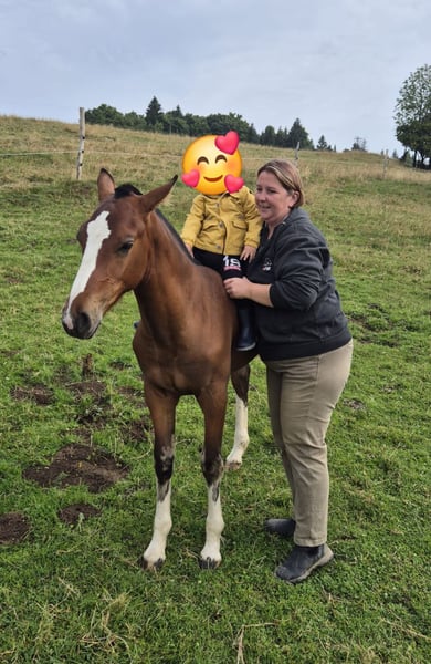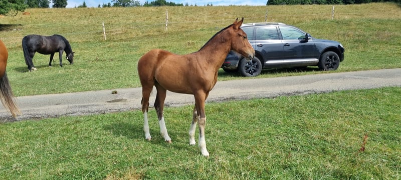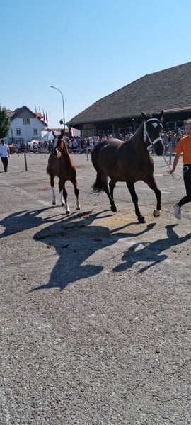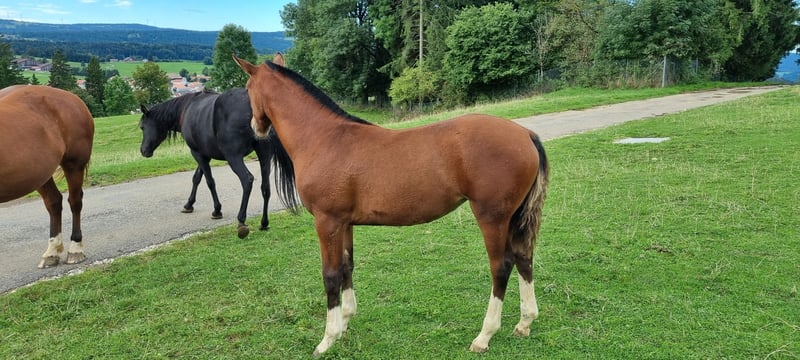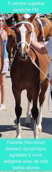 Pastelle, pouliche née le 29.03.2025 par Nonstop/Quarex, cherche son nouveau foyer. Très beau modèle avec de jolies allures, elle fera une jument élégante, agréable à vivre et polyvalente. Elle est manipulée régulièrement, très facile aux soins (brossage, douche, attache, donne les pieds), chargement et transport en van sans problème. Pour une visite et/ou plus de renseignements, n'hésitez pas à me contacter +41 79 261 49 55.