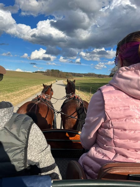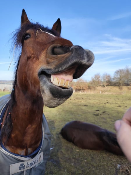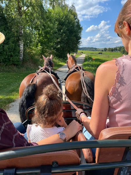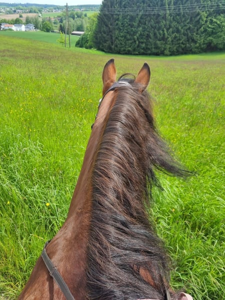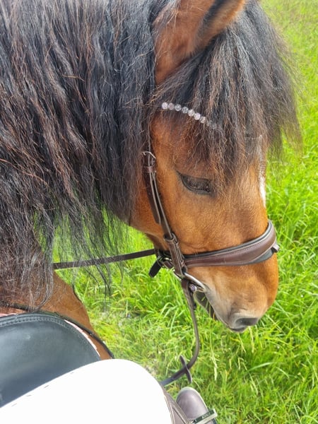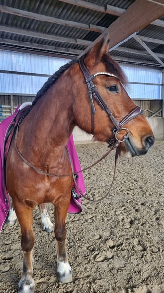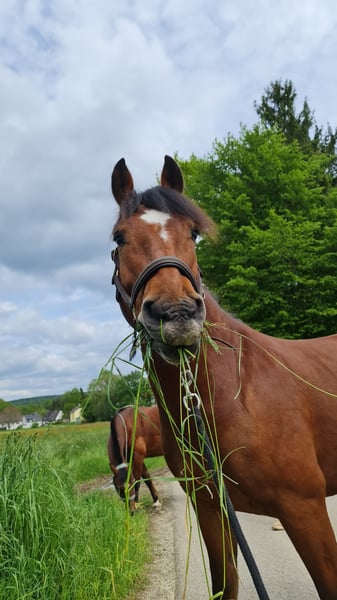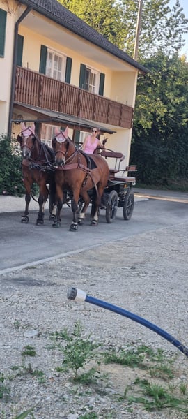Eddie Enzo Freiberger Wallach Geb. 2015 Barhuf Aktuell Offenstallhaltung 152cm Mitte 2023 haben wir aus einem Schulbetrieb einen zweiten Freiberger gekauft für meinen Partner (Reitanfänger). Leider ist er kein Anfängerpferd, da er gerne buckelt. Wir haben ihn auf den Kopf stellen lassen (Blut, Röntgen, Magenspiegelung, PSSM 1 und 2 inkl Muskelbiopsie), es wurde aber nichts gefunden (ein ggr. Spatbefund ohne klinische Relevanz, hierzu gibt es sogar ein Gutachten). Seitdem er hier ist, wurde er 2023 noch professionell eingefahren (ein- und zweispännig). Ich fahre ihn nur am Zweispänner links und dort läuft er wirklich gut, fröhlich und engagiert. Allerdings fahre ich nicht soooo viel Kutsche, dass er genügend Bewegung hätte (weshalb er gerade auch echt fett ist). Er läuft fast täglich in der Führanlage und hat trotz seiner Figur eine super Kondition. Ansonsten habe ich Longe mit ihm neu aufgebaut, Verladetraining etc. Bodenarbeit kannte er schon und liebt er. Zu Beginn bin ich ihn auch draussen geritten, aber da fühlte ich mich wie auf einer Atombombe. Seit Anfang 2024 wird er nicht mehr geritten. Im Schulbetrieb vor uns hatte er wechselnde Reiter, war regelmäßig draussen und ist auch gesprungen. Ebenfalls lief er im Ponyclub mit sehr kleinen Kindern mit. Charakterlich ist er ein Kuschler, gutmütig mit Kindern, anhänglich, aber manchmal ein Nervenbündel ohne Grund. Ich verkaufe ihn als Kutschpferd. Geritten werden kann er sicherlich (er hat tolle Grundgangarten), aber seine Stärke und Vorliebe ist die Kutsche. Als Reitpferd ist er mir zu "unberechenbar". Ich wünsche mir für ihn Offenstall oder zumindest tagsüber in der Herde draussen (Box kennt er nicht wirklich) und mehr Bewegung und Ansprache als ich sie ihm bieten kann. Er ist regelmäßig geimpft, entwurmt und einmal jährlich wurden Zähne gemacht (zuletzt vor 2 Wochen). Bei weiteren Fragen gerne melden.
