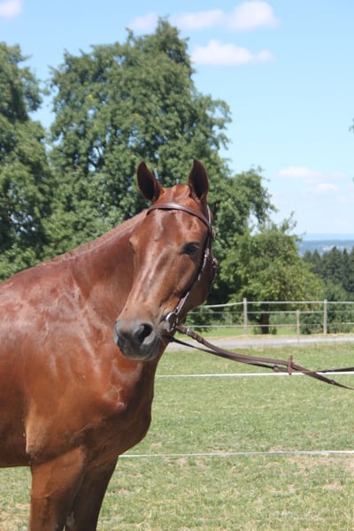 Hongre, rouan, 153 cm, âgé de 3 ans et demi Ce jeune hongre de 3 ans et demi est utilisé depuis quelque temps pour des randonnées en extérieur encadrées. Il peut être monté aussi bien par des enfants, des adolescents que par des cavaliers peu confiants. Il n’a aucun problème à partir seul en balade – il n’est ni peureux ni craintif. Il est également travaillé en longe et sur le manège, en fonction de son âge. Ce hongre a passé un test de terrain et est actuellement régulièrement conduit en attelage simple et double. Il est parfaitement sûr en circulation. Il est extrêmement calme en main et très posé. Il pourrait tout à fait être utilisé en rééducation par le biais de l’équithérapie. Son espace de mouvement est plutôt limité, ce qui le rend idéal pour les enfants, même en galop. Nous le voyons aussi évoluer dans le domaine du western. Il évolue dans une exploitation agricole dynamique, avec de grandes machines, des tracteurs, des enfants qui jouent, etc.