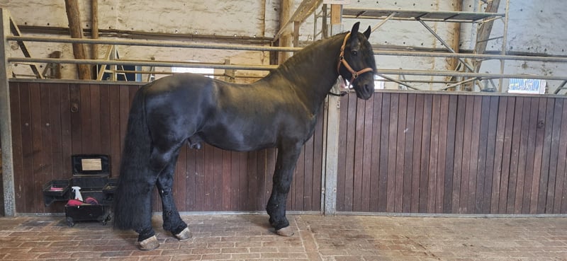 Looking for a new owner for this wonderful Friesian stallion. The horse will only be sold with a protection contract. Farrier and loading-friendly, no vices, very gentle in handling, affectionate and people-oriented. He always wants to please. Unfortunately, due to an injury, he is no longer fully sound for demanding work. Later, he could be used as a leisure horse if he continues to heal well. Currently fitted with special shoes, which will likely need to remain long-term. Further details are available upon request. Price on request. He is currently being lightly exercised in walk to build up his condition.