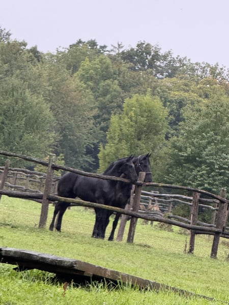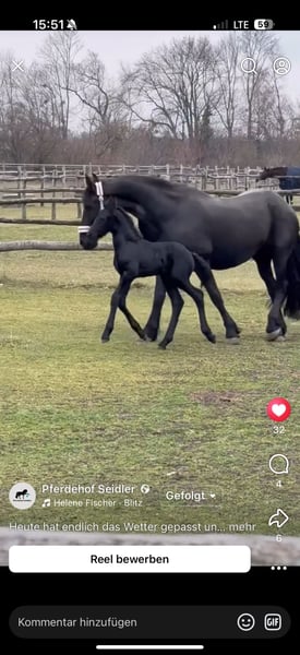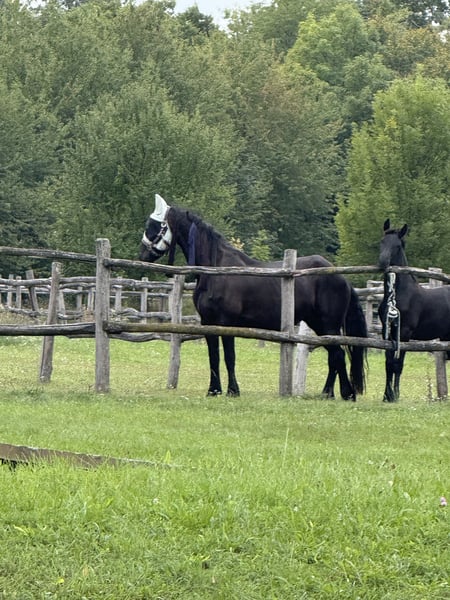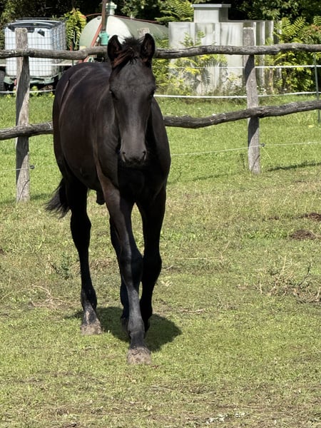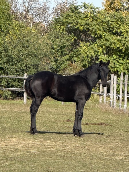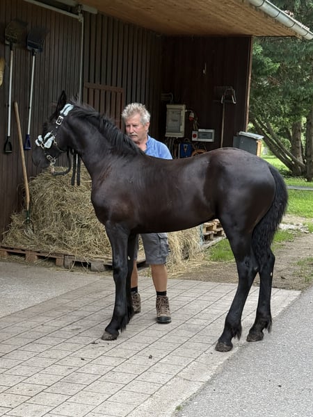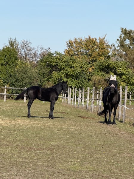 For sale: a promising young Friesian stallion – perfect for dressage and sport! This elegant black Friesian stallion was born in 2025. He captivates with his noble appearance and friendly temperament. Standing at 14.8 hands, he is already well-developed and shows great potential for dressage. He is jet black and expected to grow larger. His dam comes from a sport-oriented lineage, and his sire is a multiple-time Olympic dressage participant. His calm nature and pleasant character make him an ideal partner for ambitious riders seeking a reliable young stallion. Please feel free to contact me for more information or if you are interested.