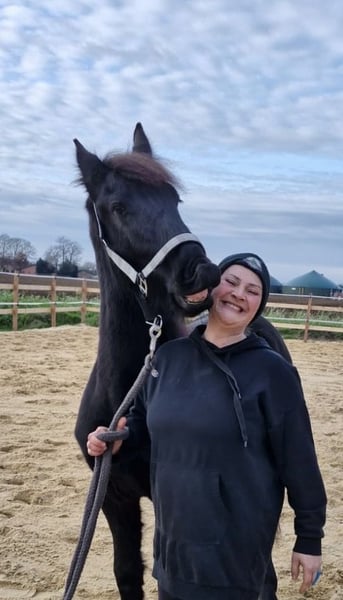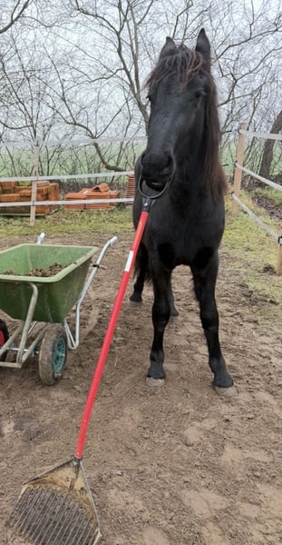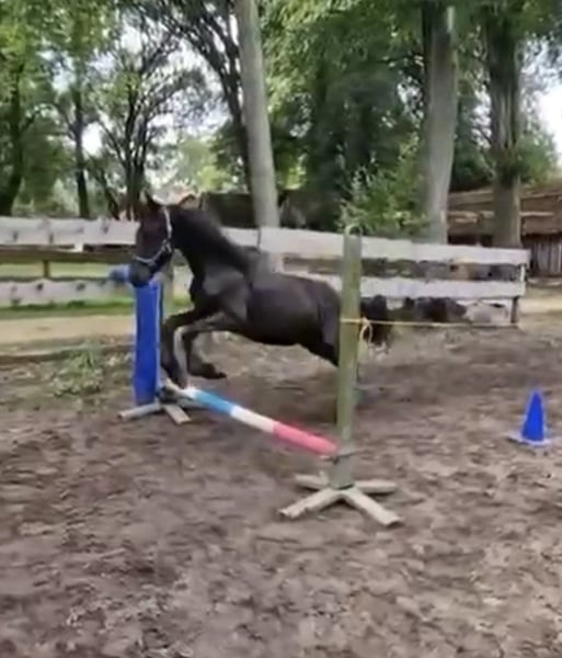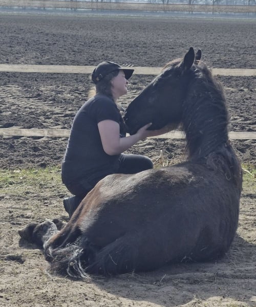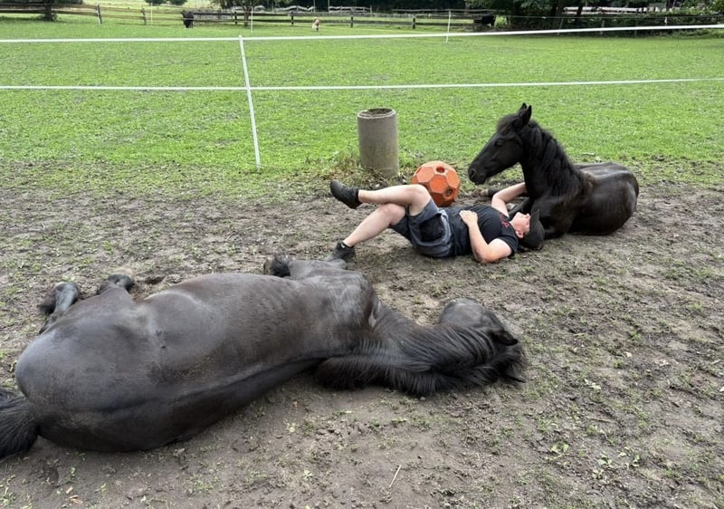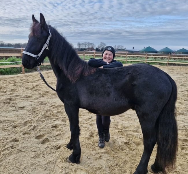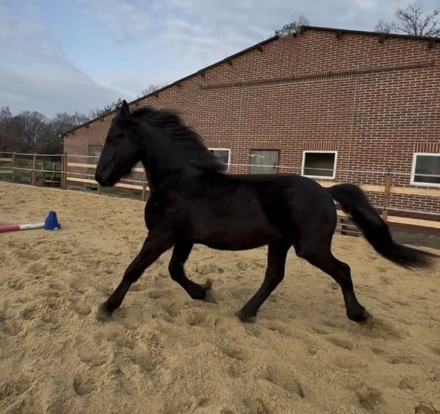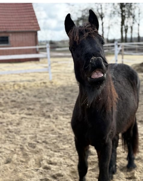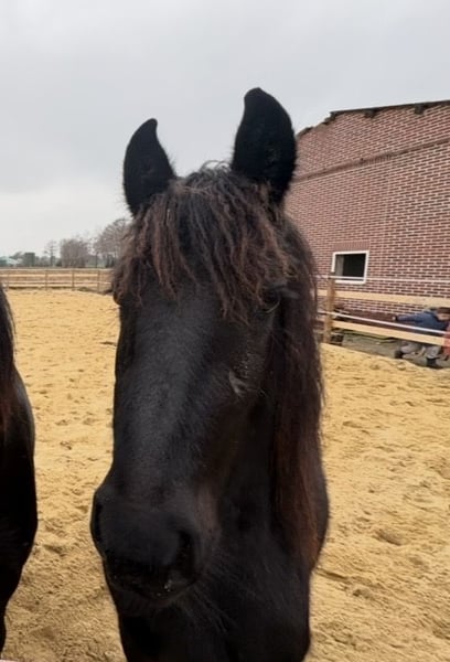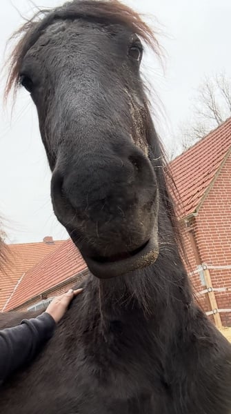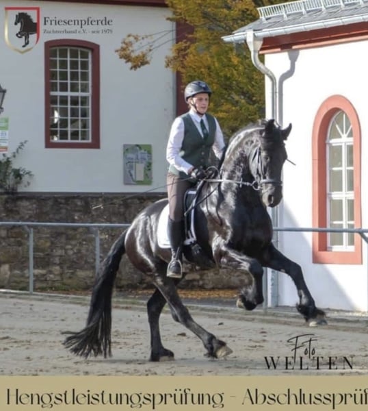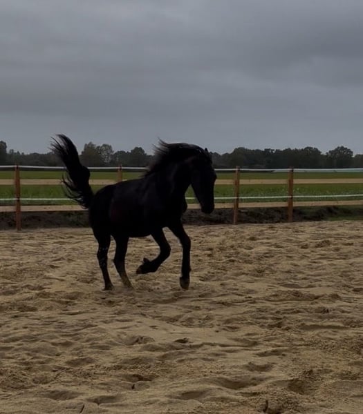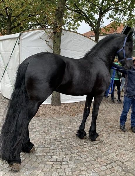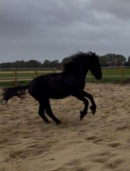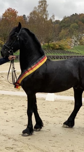 Gentle, brave, curious Friesian colt 2-year-old Friesian stallion Fully registered in Germany, very affectionate and cuddly, smiles on command Knows how to walk on a lead, stand tied, be groomed, bathed, pick up hooves, travel in a trailer, use a horse scale, and is familiar with the veterinarian, farrier, children, dogs, tractors, trucks, excavators, etc. No impairments or health issues. The sire is visible in the last photos and has become the champion of stallion performance among warmbloods in Dillenburg due to exceptional rideability. More details gladly available via private message.