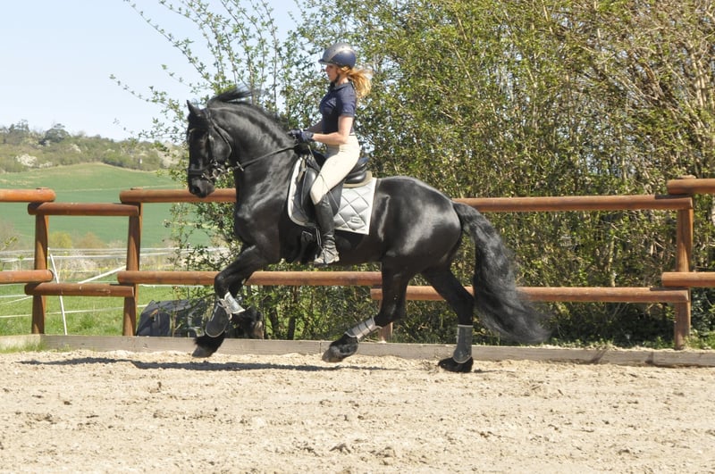 Un Friesian muy dulce de los Países Bajos con un carácter excepcional. Tiene una buena conformación y una melena muy larga. Aunque es semental, no muestra comportamientos típicos de semental. Se comporta más como un potro, lo cual resulta muy agradable, incluso en entornos desconocidos. Ha sido montado en la modalidad de 3 GGA, al menos en nivel A, y también realiza galopes en el exterior. Tiene un temperamento equilibrado, ni demasiado enérgico ni perezoso. Además, conoce el terreno y el tráfico vial. Realiza paseos en grupo o solo sin problemas. También está entrenado para conducir en sulky de 1, 2 y 4 caballos. Por favor, las consultas solo por teléfono.