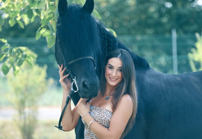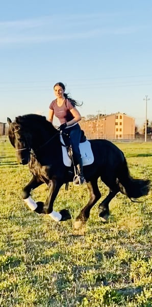 FOEKE VAN DE DEMRO STABLES (JEHANNES 484 X KYRA W.T) Splendid 8-year-old entire Friesian (doesn't even know he is one). Height 1.72 at the withers. A horse of unique beauty and kindness. VERY HEALTHY, NEVER HAD A HEALTH ISSUE. Suitable for any type of rider with a minimum of experience. IMPORTANT GENETICS!! FOR INFORMATION; +39 3917059140 (Agata) +39 3513334724 (Fabio) Asking price: €40,000