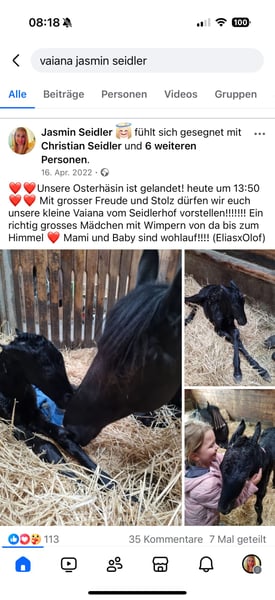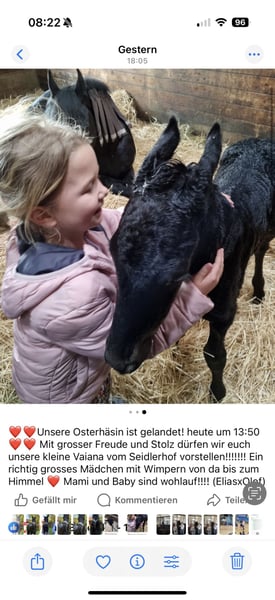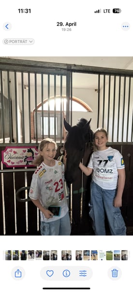 Vendemos nuestra yegua Frisona criada en nuestra propia cuadra, Vaiana del Seidlerhof. Es una yegua de carácter deportivo, con mucho talento y aprende muy rápido. Ya está montada y actualmente se encuentra en nuestro descanso de verano. Tiene una melena y una cola abundantes. Su padre, el semental Frisón Elias 494, compitió a nivel internacional en doma clásica hasta el Gran Premio, y su madre es una verdadera joya, lo que convierte a Vaiana en una yegua excepcional con todas las puertas abiertas para su futuro.
