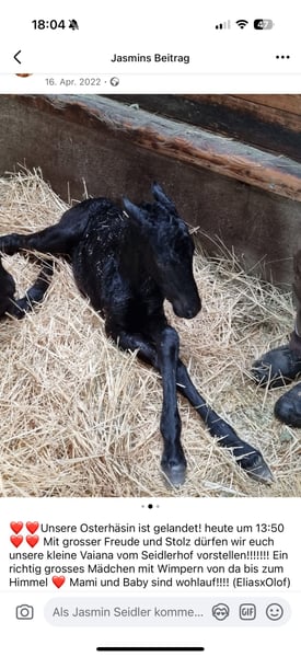 Vendiamo la nostra puledra Friesian Vaiana, allevata da noi al Seidlerhof. È una cavalla sportiva, dotata di grande talento e apprende molto rapidamente. È già stata messa in lavoro e attualmente si trova in pausa estiva. Ha una criniera e una coda molto folte. Suo padre, il stallone Friesian Elias 494, ha gareggiato a livello internazionale nel dressage fino al Grand Prix, mentre sua madre è una vera gemma, rendendo Vaiana una cavalla eccezionale con tutte le porte aperte per il suo futuro.