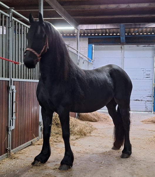 Haylinn is a beautiful, breed-type Friesian mare. She moves very well and has a long, flowing mane. Haylinn has been used by us for breeding purposes and has not been trained under saddle or for driving. She is a good mother and has given us beautiful, healthy foals. Haylinn has never been presented at a keurings. Due to a reduction in our breeding program, we are offering her for sale. Haylinn is confirmed pregnant for 2026 with the Friesian stallion Nyk 538. For more information, please call or WhatsApp +31 641 043 916.