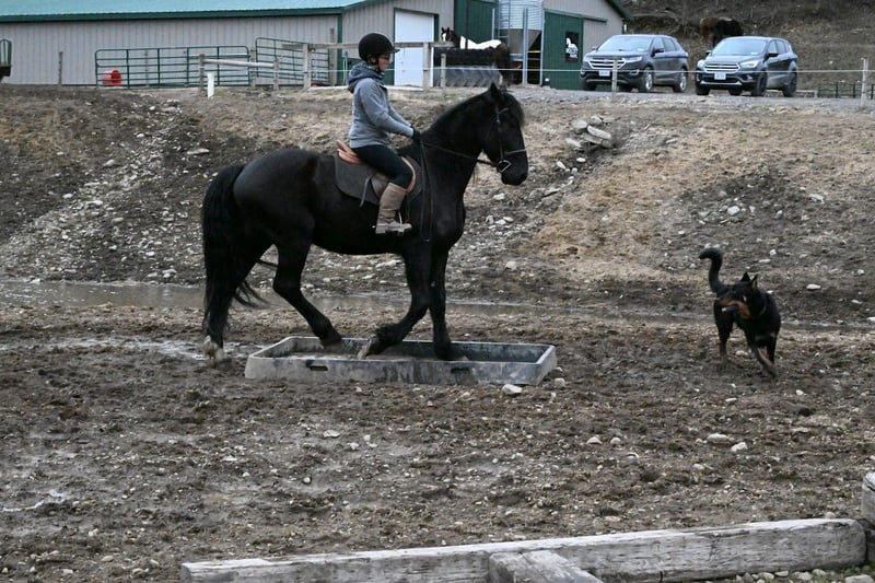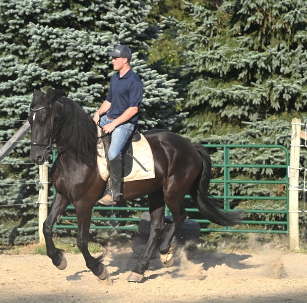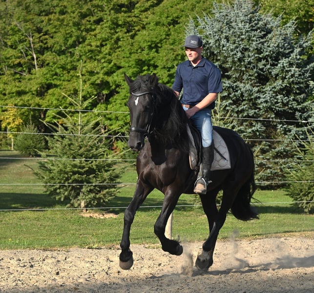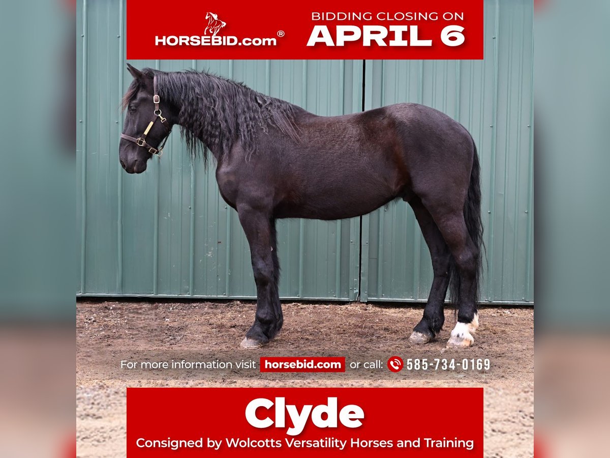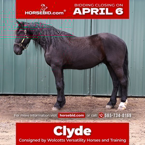 🌟𝑨𝒑𝒓𝒊𝒍 𝐀𝐋𝐋 𝐒𝐓𝐀𝐑 𝐋𝐈𝐍𝐄𝐔𝐏🌟 Happening now thru MONDAY | APRIL 6th - Available EXCLUSIVELY on HorseBid's website! For more details and to register visit: www.Horsebid.com CONSIGNOR CONTACT: Wolcotts Versatility Horses and Training 585-734-0169 LOCATION: Warsaw, NY BREED: Friesian cross REGISTERED: Yes REGISTERED NAME: Clyde COLOR: Black HEIGHT: 16.3 AGE: 4 GENDER: Gelding **Clyde comes with a 2-week guarantee ** Clyde is a registered 4-year-old Shire/Friesian cross gelding standing 16.3h tall. He has a nice walk, trot, canter, and moves off your leg with ease. He is soft in the face and always wants to please his rider. We have used Clyde for various events on the farm, such as trail rides, lessons, driving, and on our obstacle course; he does it all. Clyde has many miles out on the trail and in the arena. He will lope a nice circle in the arena and then ride out alone or with a group on a trial ride, crossing water, logs, and ditches with no problem. Clyde is not only great at riding, but he also drives! His steady nature and willingness to learn new skills make him a reliable partner for any endeavor. Clyde is versatile and easy-going. Clyde is easy to load into a trailer and unloads like an old seasoned horse. He has excellent ground manners, stands quietly tied, and is a true gentleman for the farrier and vet. Clyde is a reliable, well-rounded horse that everyone can enjoy. Clyde sells 100% sound with no vices. PPE is welcomed at the potential buyer's expense. Contact Dayton at 585-734-0169 for more information on Clyde