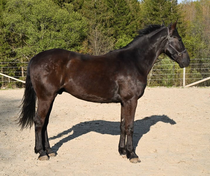 ONLINE AUCTION Place your bids at www.PlatinumEquineAuction.com Starting Bid $3500 Auction ends August 17th, 2025 Need a new saddle? Check out White Rock Saddles on our website or Facebook Sable is a stunning 4-year-old Friesian/Morgan cross gelding standing a solid 15.3hh. He has the kindest eye and an incredibly sweet, puppy-dog personality. Sable is solid broke and ready to head in any direction you choose—whether you’re looking for a confident trail partner, a lesson horse, a pleasure horse for arena work, or a show partner, Sable fits the bill. He rides out quietly alone or in a group and gets along with every horse he meets. With his calm demeanor and eagerness to please, Sable is the kind of horse that’s easy to fall in love with. He’s smooth and steady at the walk, trot, and canter, and goes both English and Western—perfect for someone who enjoys variety. He confidently crosses bridges, rides through water, and handles all kinds of farm animals with ease. He gives 100% every time and is a true joy to ride—so much so that we’ve used him in both youth and adult lessons. He’s been ridden all over the farm by an 8-year-old girl in the video, showcasing just how gentle and reliable he is. Sable is sound, healthy, and has no special dietary needs. He’s barefoot with great feet, trailers like a dream, and stands politely for the vet and farrier. With his whole life ahead of him, this sweet gelding is ready to become someone’s best friend and trusted partner for many years to come. Sable is located in Warsaw, NY. Contact Dayton Wolcott 585-734-0169 for more info or to come meet Sable! ONLINE AUCTION Place your bids at www.PlatinumEquineAuction.com Starting Bid $3500 Auction ends August 17th, 2025 Need a new saddle? Check out White Rock Saddles on our website or Facebook