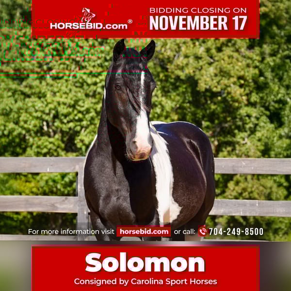 🎲𝓽𝓱𝓮 𝐑𝐈𝐃𝐄𝐑'𝐒 𝓒𝓱𝓸𝓲𝓬𝓮🎲 Happening now thru MONDAY | NOVEMBER 17th - Available EXCLUSIVELY on HorseBid's website! For more details and to register visit: www.Horsebid.com CONSIGNOR CONTACT: Carolina Sport Horses 704-249-8500 LOCATION: Clover SC BREED: Friesian Spotted Draft X REGISTERED: No COLOR: Black and White Paint HEIGHT: 15.2 AGE: 6 GENDER: Gelding Meet Solomon, a stunning 6-year-old Friesian Draft cross gelding who embodies everything today’s discerning rider looks for — presence, patience, and pure versatility. Standing 15.2 hands and weighing in at a solid 1,400 lbs, he carries himself with the balance and confidence of a seasoned schoolmaster, yet the kindness and forgiveness that make him an ideal family or program horse. Solomon offers a comfortable, rhythmic walk, trot, and canter, all beautifully balanced. Whether in the arena or out on the trail, he is steady, surefooted, and exceptionally safe. His transitions are smooth and his demeanor calm — making him a pleasure for riders of all skill levels. Solomon has been schooled by riders as young as nine, and he meets every one of them with quiet patience. He’s trustworthy enough for children or beginners, yet talented enough to satisfy more advanced riders who appreciate refinement, power, and beauty in one package. He’s equally at home carrying a first-time rider as he is under a professional’s instruction. In the barn, Solomon is a true gentleman — patient to groom, tack, bathe, and handle. He enjoys attention, trailers with ease, and stands quietly for farrier and vet. His sweet personality and calm, gentle eyes win over everyone he meets. A Once-in-a-Lifetime Partner! If you’ve been searching for a horse that checks every box — beauty, temperament, size, and training — look no further than Solomon. He’s the kind of horse that gives riders confidence, families peace of mind, and trainers pride in his every step. *All of our descriptions are OUR OPINION and ARE NOT FACTS. They represent how the horse responded and behaved while in our care. Horses can change at any time as they are living, breathing animals. There are no warranties expressed or implied via the descriptions above*PLEASE READ OUR BUYERS GUIDE PRIOR TO BUYING OR BIDDING ON ANY HORSE WE HAVE AVAILABLE.