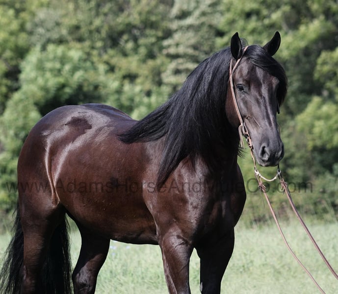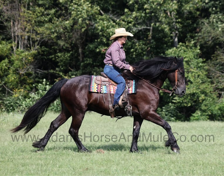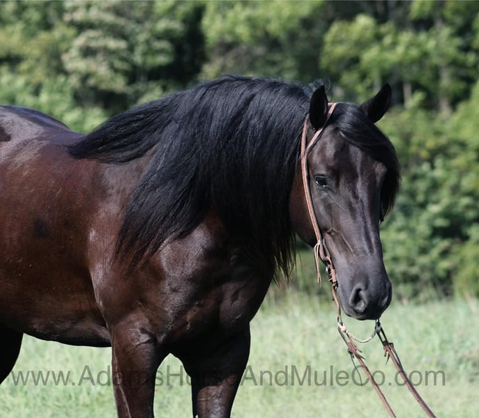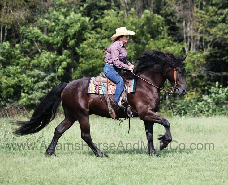 Go to www.AdamsHorseAndMuleCo.com for more pics and a video. AHAMC has been in the horse business and sold horses over the internet since 2005. We have a long track record of success with hundreds of happy customers. We work hard to match riders with the correct horses and specialize in beginner safe, family friendly horses that have been used and checked out by our family! WOW take a look at Salem! Salem is a Friesian cross gelding, weighing 1200lb, he is 5 years old, he stands between 15.3 and 16h and he is a beautiful black color with a long flowing mane and tail! He looks like something straight out of a fairy tale… but Salem is the for real!!! He is friendly with lots of personality! Salem is out of the same breeding program as several other top draftcross geldings that we have had over the last 4 years and every one of them has the right mind with the calm nature that makes them great family horses. Salem has been in the program for two years and has completed the natural horsemanship training and does liberty work and he also knows some tricks, he will bow, lay down and set on his rump. Salem is a family favorite whether it’s riding or just hanging out getting pampered by the kids, everyone loves him! He has been ridden down the highways and he is traffic safe as well. Salem is harness broke and has been used on the farm in all implements as well as drove down the highways. Salem is great on trails and he will cross creeks, ditches, logs and navigate rough rocky areas. He has a smooth jog, a VERY VERY nice easy to set lope, a good stop, turns a circle both ways and backs with ease! He has been exposed to all kinds of wildlife such as deer or turkey or other animals like cows or dogs and will go anywhere that he is asked too. He has been rode many miles in the mountains of Eastern Kentucky and encountered every obstacle possible on the trail. He will go up or down even the steepest slopes, across deep creeks, over downed trees, and over all types of rough terrain while still being sure footed. Salem is not cinchy, cold backed, does not crib or weave. Salem is the horse that will make dreams come true!!! Feel free to call Eric 606-308-2461 with any questions.