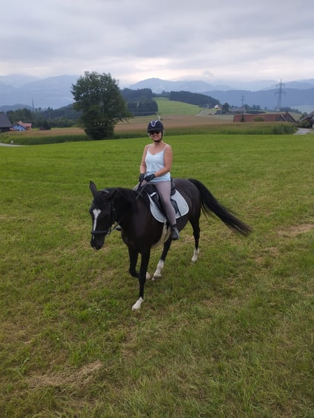 Summer ist eine 11jährige Rappstute 1,60m groß und mit viel Potential, das gefördert werden will. Sie lebt derzeit mit drei Stuten in einem Offenstall und ist im mittleren Rang. Sie ist barhuf unterwegs. Auf neue Pferde reagiert sie zurückhaltend und vorsichtig, legt dieses Verhalten aber bald ab. Der neue Besitzer sollte ein sicherer und erfahrener Reiter sein, der gerne mit dem Pferd arbeitet und dessen Potential (schöne Gänge) schätzt, fördert und weiterbildet. Im Umgang (putzen, führen) ist sie pflegeleicht, an der Longe ist sie temperamentvoll und hat viel Energie, aber mit Konsequenz baut sich das ab. Bei Ausritten im freien Gelände zeigt sie Dominanz und braucht daher eine erfahrene und konsequente Hand. Darüber hinaus eignet sich Summer auch als Zuchtstute ( Abstammung „North Star“). Dem Level von Summer kann ich als Wiedereinsteiger leider nicht gerecht werden und das beeinträchtigt die Chemie zwischen uns. Da ich für Summer nur das Beste möchte, habe ich mich nach 2 Monaten dazu entschlossen, ein neues und geeigneteres Zuhause für sie zu finden. Ein Probereiten kann selbstverständlich vereinbart werden. Da wir über kein Viereck verfügen, ist das Reiten nur im freien Gelände möglich (bitte nur erfahrene fortgeschrittene Reiter).