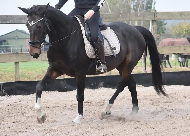 Brave, correct, experienced large E-level dressage horse, ridden and handled Farmer’s Pride Jester is the pride of his breeder; he is a horse with a heart of gold! He stands approximately 1.56 meters tall and was born in 2008. He has already gained riding school experience at a care facility. Jester holds a recent inspection report including blood tests, confirming his suitability for sport! He comes from a full pedigree: Rayo X Perrybridge Touch and Go x Joey. He is suitable for a rider who is not yet very advanced, but he offers the experienced rider more than enough challenge to achieve a lot! Suitable for both sport and recreational riding. Recently treated by the dentist as well. Yester is an incredibly honest horse. The price is very reasonable; he’s not the type that needs to be pushed forward 🙂 He has recently been dental checked, with a current report available. Price € 3,450 now reduced to € 2,450 including branded saddle