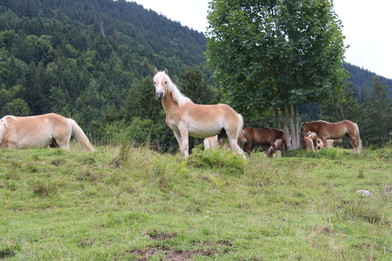 Haflinger yearling, né le 27 avril 2024 ; étalon correct avec une taille finale estimée à 150 cm ; amical, affectueux, équilibré, curieux et sociable ; type calme, belle démarche, bien élevé lors des soins des sabots ; chargement et vermifugation sans problème ; sur le papier, il a les prérequis pour la reproduction ; sa mère l'a sevré à 10 mois ; également échangeable contre jument ; - actuellement au pâturage des étalons ; devrait revenir fin septembre ; - a obtenu une note globale de 8,5 au "Championnat des poulains de Bavière 2024, Munich" ; - habitué au bruit de la circulation y compris les sirènes, le bruit des hélicoptères et des trains ; Voici quelques impressions du pâturage (30.07). Il a plu pendant plusieurs jours... on le remarque chez les chevaux ; c'est un groupe principalement de chevaux de 2 ans et quelques yearlings ; les plus âgés sont plus foncés, les jeunes sont clairs ; aujourd'hui, j'étais de nouveau là-haut... l'ambiance est meilleure, les fins et clairs sont des yearlings, les foncés et musclés ont entre 2 et 3 ans ;