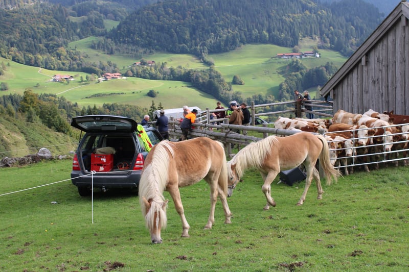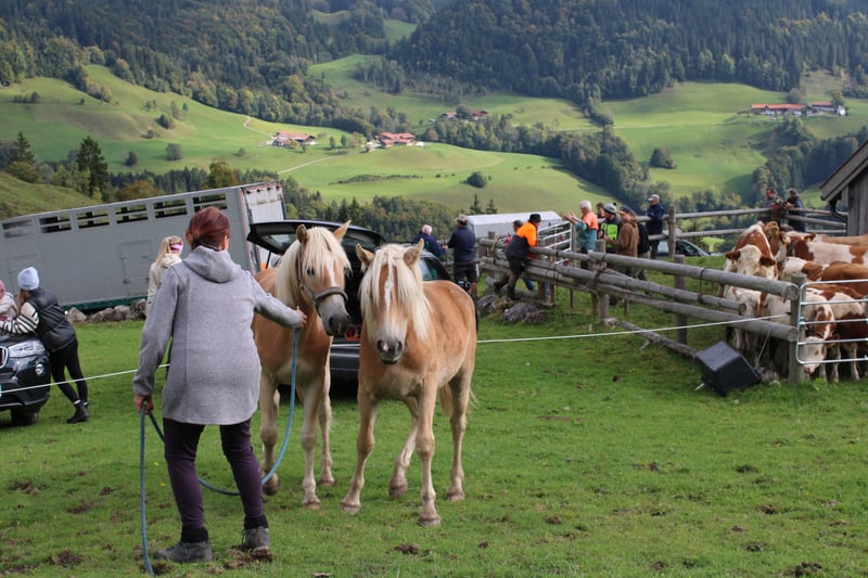 Haflinger-veulen, geboren op 27 april 2024; correcte hengst met een verwachte eindhoogte van 150 cm; vriendelijk, lief, evenwichtig, geïnteresseerd en sociaal; rustige type, mooie stap, braaf bij het hoefonderhoud; probleemloos laden en ontwormen; op papier heeft hij de vereisten voor de fokkerij; zijn moeder heeft hem op 10 maanden gespeend; ook als ruil tegen merrie; - momenteel op de hengstalm; komt waarschijnlijk in september terug; - heeft een totale score van 8,5 behaald bij het "Bayerisch Fohlenchampionat 2024, München"; - is gewend aan straatgeluiden, inclusief sirenes, helikopter- en treinlawaai; Hier een paar indrukken van de alm (30.07). Het heeft dagenlang geregend... dat is te merken aan de paarden; het is een groep van voornamelijk 2-jarigen en enkele veulens; de oudere zijn donkerder, de jongere lichter; vandaag was ik weer boven... stemming beter, de dunne, lichte zijn veulens, de donkere, gespierde zijn 2- tot 3-jarigen;