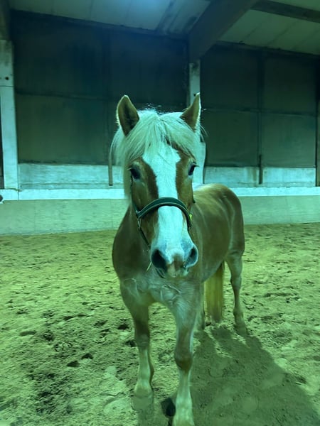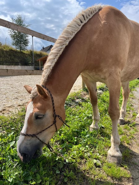 Bjolla ist eine 8 jährige Tiroler Haflingerstute aus der Zucht von Christian Mark. Sie ist 148 cm, im Tiroler Grundbuch I eingetragen. Ihr Vater ist Amerigo, ihre Mutter ist Braveheart von Straden aus einer Nabucco Mutter. Bjolla ist brav im Umgang, schmiede- und verladefromm. Bei uns läuft sie sehr gut barhuf, kann aber auch gerne ihre Hufschuhe mit ins neue Zuhause bringen. Sie ist sicher von Erwachsenen und Jugendlichen in Halle, Feld und Straßenverkehr geritten. Bei der Arbeit braucht sie eine faire aber klare Hilfengebung. Fühlt sie sich ungerecht behandelt, gibt sie Antwort. Für den Schulbetrieb oder unsicheren Reiter ist sie daher nicht geeignet, da sie Fehler nicht immer verzeiht. Eine persönliche Bindung zum Reiter ist wichtig für sie. Sie hat einen eigenen angepassten Westernsattel, der ebenfalls miterworben werden kann. Läuft aber auch gut mit einem englischen Sattel.