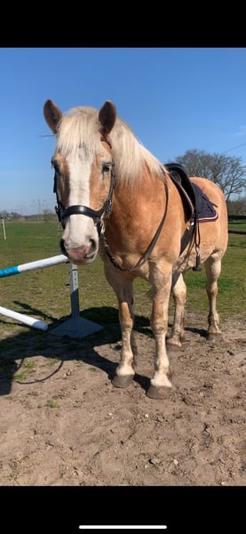 Ben jij op zoek naar een veelzijdig maatje dat nog jarenlang plezier wil maken? Deze knappe ruin van 16 jaar en 151 groot is klaar voor een nieuw avontuur. Hij heeft een stevige bouw. Hij is braaf in de omgang, werkwillig, intelligent en ook zeker een clown! Hij gaat graag op buitenrit maar ook in de bak laat hij zien dat hij dressuurmatig ook veel in zijn mars heeft. Daarnaast vind hij springen leuk en ook zeker een cross doet hij graag! Hij is braaf met de eigenwijsheid van een haflinger. Hij vind het fijn als hij zijn maatje goed leert en kennen en gaat dan ook echt voor je door het vuur. Hij is goed verkeersmak maar kan buiten wel wat sterker zijn. Ik denk dat hij het beste geschikt is voor een zekere ruiter. Hij is braaf bij hoefsmid en tandarts. In december is hij behandelt door de osteopaat behandeld. Trailer laden vind hij spannend maar met wat rust en vertrouwen gaat hij met je mee. Wegens mijn gezondheid zoek ik voor hem een nieuwe thuis. Hij staat bij ons 24/7 buiten met toegang tot stal, maar ook ‘s nachts op stal is hem gewoon. Filmpjes stuur ik niet, maar u bent zeker welkom om te komen kijken.