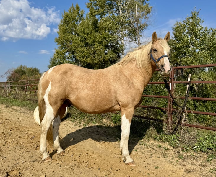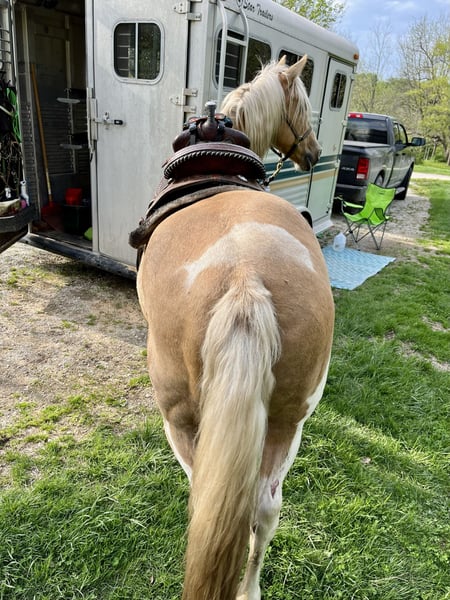 "AVAILABLE ON ONLINE HORSE AUCTION AT www DOT MagicHorseAuction DOT com BIDDING OPEN NOW thru TUESDAY | FEBRUARY 17TH! - BUY IT NOW AVAILABLE! *Final price will be determined on auction site* CONSIGNOR CONTACT INFO: Michelle Sailor #612-221-0855 LOCATION: River Falls, WI " "Kilmer is a gelding who checks a lot of boxes. He’s super cute, friendly, versatile, and has the greatest personality. He’s even got a dolphin shaped spot jumping over his tail! He rides inside and outside. He’s good with flags and obstacles. He side passes, knows his leads, is good with leg pressure, rides direct and neck rein. He was at an English barn before I got him, but I’ve mainly camped with and trail ridden him. Took him on week long trips to Tennessee last year and Yellowstone this year. Jumps right into the trailer and backs out calmly. He’s an energizer bunny and will go all day or all weekend. Crosses water and bridges with no issues and walks through brush, over logs, and off trail calmly. We rode through a ground bee hive last year and he was one of the only horses that did not freak out and essentially just high stepped through the area. He rides at the front, middle, and at the back of the group with ease and is very friendly with other horses. At Yellowstone this year, he was in a stock trailer between two horses he didn’t know when we went to trailheads and got along with them as though they’d known each other forever. For riding alone outside, he does well with someone who’s ridden some before, but is great in a group. He’s very curious and willing to try new things. He has clean legs and is barefoot, I’ve never had any issues with soundness. I did put four shoes on him for the Tennessee and Yellowstone trips though and he stood great for the farrier. Very easy keeper, stalls well, and pastures well with anyone. He’s a very low maintenance horse. I’m selling him because unfortunately, I’m not financially able to keep him anymore."