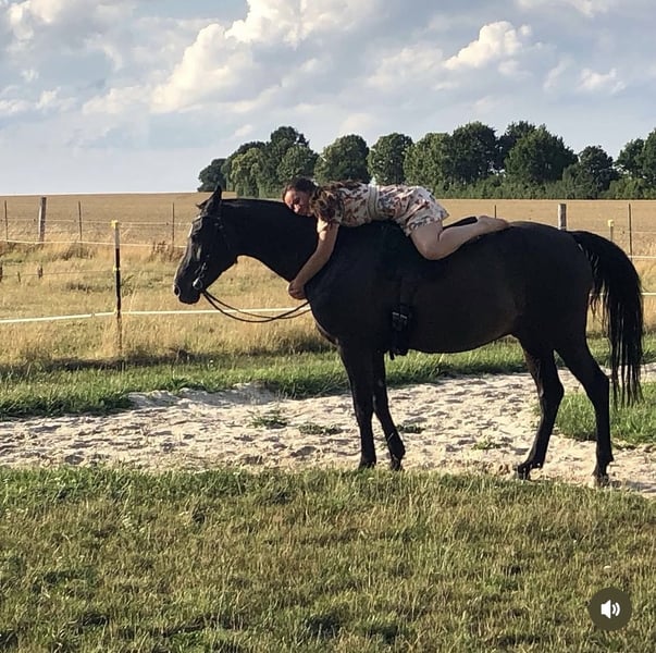 Mein Name ist Anja, ich bin Energetikerin und Traumacoach für schwere sexuelle und rituelle Missbräuche. Der Weg ist geebnet und das Herz ist nun frei. Auch seins darf jetzt nach all den Jahren, die wir gemeinsam miteinander verbracht haben nun weiterziehen. Zu einem lieben Menschen, der viel Freude mit ihm und umgekehrt hat. Morpheus ist nun fast 18 Jahre alt und ist ein großartiger Lehrmeister im Umgang mit sich selbst und allen Lebewesen seiner Umgebung. Der Sattel ist angepasst und jetzt 5 Jahre alt. Aufgepolstert im Frühjahr 2025. Baucher Stange ist tatsächlich sein liebstes, aber auch Halsringreiten auf eingezäuntem Gelände ist kein Problem. Er ist verlässlich und trittsicher im Gelände. Versteht sich gut mit anderen Pferden. Er liebt idealerweise die Offenstallhaltung. Den Stallstaub vom Stroh verträgt er weniger gut. Geritten wurde er die letzten 12 Jahre nach klassischen Grundsätzen. Erste Ansätze der Piaffe und Passage haben wir gemeinsam mit unserer Trainerin erarbeitet. Gerne darf er weiter tensegral gearbeitet werden. Hier sind mindestens 2-3 Kurse bei Linda und Vroni in Hannover zu empfehlen. Er ist schmiede- und verladefromm und macht jeden Quatsch mit, den man sich so ausdenken kann. Trotzdem ist er kein reines Anfängerpferd, für den älteren Nachwuchs ab 15 Jahren jedoch sehr gut geeignet. Rassemix Warmblut x Quarterhorse aus der mütterlichen Linie Vater Araber