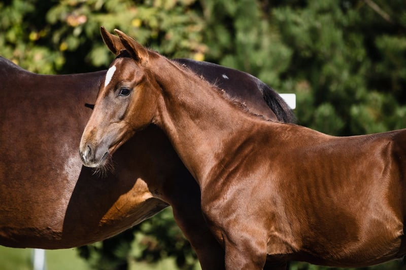 Vertigo is a son of fabulous stallion Va Bene and an amazing black mare Finchen. He is chestnut with a star on his beautiful head. He’s very typey and correct, and has long lines in his body. His movement is very dynamic and smooth, he engages his hind end well. His nature is so ingenious, he is incredibly trusting and people-oriented. He wants to work with people and you can see he enjoys it. Vertigo’s father, chestnut Va Bene, is a grandson of a famous Vitalis, known for incredible rideability and amazing movement, which all of his descendants inherit. Va Bene is a very relaxed horse with great mechanics, he has a huge amount of balance in all three basic gaits, which he displays in all performances under saddle. At the end of 2019, he completed a first-class 50-day test with the final score of 8.59 in Schlieckau and is now tested for life. His character showed a great willingness to perform and gave a strong overall impression, he received the grade 9.0. In an impressive year he was ranked second with the rideability 9.25. Va Bene was already victorious in ridden horse tests with top marks (including 9.5 for the canter). In 2021, Va Bene celebrated remarkable sporting successes! He was able to qualify for the 2nd World Championships in Warendorf and immediately for the Bundeschampionat.