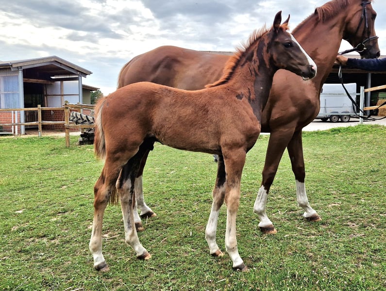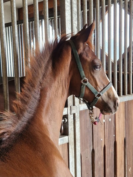 Typvolles großrahmiges Hengstfohlen mit viel Noblesse und hochsportlicher Eleganz vom Ausnahmehengst Dimaggio Black (Sporttestsieger 9,40). Er besitzt drei sehr gute Grundgangarten mit einem aktiven,Hinterbein. Das sehr korrekte langbeinige Fundament unterstreicht die ultramoderne edle Silhouette. Er ist super-brav und angehm im Umgang. Er ist Halbsbruder zu „Mount St. John Diamonds are Forever“ (von Diamond Hit, bestes 4-jähriges Dressurpferd 2020 in England und inzwischen Inter I ungeschlagen und Grand Pix erfolgreich). Nachkommen der Mutter Rheinita sind bereits erfolgreich in England, Österreich und Spanien. Die Urgroßmutter Faith Hill (StPrSt v. Florestan I) lieferte bereits hochpreisige Auktionsfohlen und bis zur S-Klasse erfolgreiche Dressurpferde. Ihr Vollbruder Freixenet wurde über die Verdener Auktion an Isabell Werth verkauft und von ihr erfolgreich in der Klasse S vorgestellt. Die UrUrgroßmutter ist Vollschwester zum Bundeschampion Boccacio (v. Bolero, 4j Reitpferde), die UrUrUrgroßmutter ist Vollschwester zum Celler Landbeschäler Grunewald (v. Grande x Duellant). Aus diesem hocherfolgreichen Stutenstamm der „Antipathie“ stammen internationale Sportpferde sowie Bundeschampionatssieger (Fürst Khevenhüller, H. Langehanenberg / Rospoli, J. Disterer / Lou, Franke Sloothaak / Duke of the Dance, H. Weber, etc.). Außerdem brachte diese Linie gekörte Hengste wie z.B. Royal Blend (Celle, Prämienhengst, Dres. S**), Don Bedo (Warendorf, Siegerhengst) oder Shakespeare in Love (PB, Dres. S**). Wer für Sport und/oder Zucht etwas besonders sucht hat mit diesem Hengstfohlen alle Möglichkeiten.