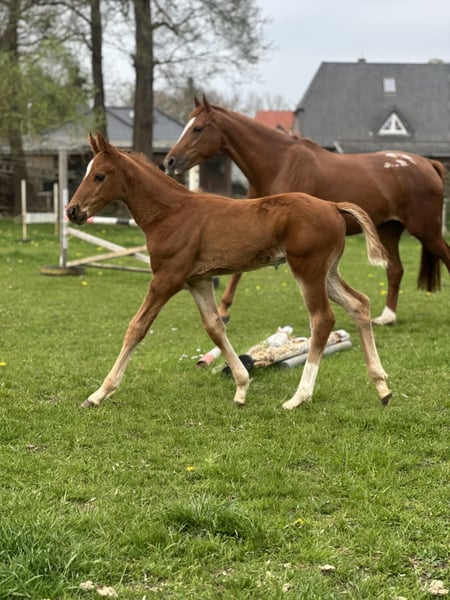 Wir geben unser am 10.03.26 geborenes Hengstfohlen ab Semptember ab, es gibt auch die Möglichkeit die Mutterstute mit zu erwerben. Die Mutter ist eine Secret X Le Primeur X Weltmeyer. Rocking Secret ist Rienzi (Raphael) X Bolero X Secret. Rocky kennt das Fohlen ABC, fährt problemlos Hänger, war ebenfalls schon bei einer Fohlenauswahl. Die Halbschwester ist bereits M-platziert, Rocky selbst zeigt im Freilauf schöne schwungvolle Grundgangarten.