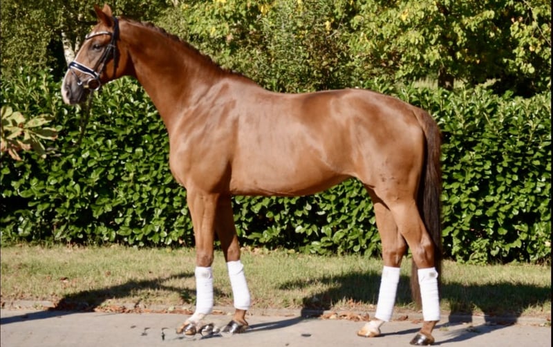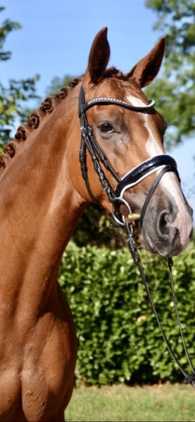 Piękna klacz od Scuderia x Dancier o bardzo dobrych ruchach. Potomstwo ogiera Scuderia odnosiło sukcesy na Mistrzostwach Krajowych i Mistrzostwach Świata Młodych Koni Ujeżdżeniowych, co czyni je interesującym materiałem hodowlanym. Ze względu na jej dużą energiczność, nie jest odpowiednia dla początkujących jeźdźców. Ze względu na brak odpowiedniego wsparcia w treningu i okazjonalne kopanie, jest sprzedawana znacznie poniżej wartości jako koń hodowlany lub koń do towarzystwa, a nie jako koń rekreacyjny. Film można chętnie przesłać na życzenie przez WhatsApp.