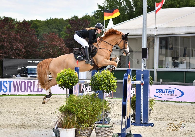 Na sprzedaż oferujemy naszą piękną, kolorową klacz rasy Hannoveraner, w odcieniu ognistego rudy – idealną dla juniora, dziecka lub ambitnego amatora, jako absolutny „magnes na spojrzenia” i kolekcjonerka pucharów. Ta przepiękna klacz rasy Hannoveraner, urodzona w 2014 roku i pochodząca od Commissario x Quidam de Revel, zachwyca nie tylko swoim atrakcyjnym wyglądem, ale także licznymi sukcesami sportowymi oraz wyjątkową jakością i chęcią do pracy na skokach. Cookie prezentuje imponującą technikę i dużą siłę skoku. Szczególnie wyróżnia się jej zaciętością i absolutną uczciwością na parkurze, co w ostatnich latach uczyniło z niej idealnego konia dla juniorów. Uczestniczyła w wielu krajowych i międzynarodowych zawodach, odnosząc sukcesy w skokach do 1,45 m. Może się pochwalić licznymi startami w zawodach dla juniorów, konkursach Grand Prix oraz dużych mistrzostwach, takich jak Hagen Future Champions czy Mistrzostwa Niemiec dla młodzieży. Cookie to prawdziwy nauczyciel i kolekcjonerka pucharów dla jeźdźców, którzy szukają radości i pewności na parkurze, a jednocześnie chcą osiągać duże sukcesy. Pomimo jej silnego charakteru nigdy nie staje się trudna, dzięki czemu jest idealna dla dzieci, juniorów czy ambitnych amatorów. W przypadku zainteresowania, dodatkowych informacji lub filmów, chętnie służę pomocą (preferowany WhatsApp) pod numerem 0176 2427 2427.