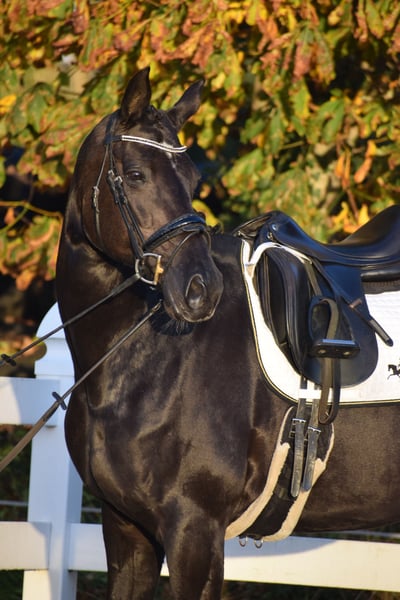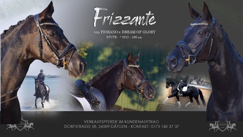 BRAVE TYPSTARKE LEHRMEISTERIN MIT TRAUMHAFTEM CHARAKTER - DRESSUR M* MEHRFACH PLATZIERT - SPRINGEN BIS A** TRAINIERT - JUNIOREN GEEIGNET - FAMILIENPFERD - FREUNDIN FÜRS LEBEN - JUNIOREN GEEIGNET - FAMILIENPFERD - FREUNDIN FÜRS LEBEN Zum Verkauf steht in Vertretung des Besitzers, diese wunderschöne, absolut sympathische, 168 cm große, top fitte 13-jährige (*2012), Hannoveraner rapp Stute, mit bester Abstammung von FIORANO x DREAM OF GLORY. „FRIZZANTE“ weiß in jeder Hinsicht zu überzeugen. Optisch besticht sie mit lackschwarzer Jacke, typvollem Gesicht, toller Muskulierung und einem auffällig gut konstruiertem Gebäude. Charakterlich ist Sie unschlagbar und für jeden Spaß zu haben. Ob im Dressurviereck, bei Strandausritt oder im Parcour, sie ist ein Spaß-Garant. Sie ist ein feines ruhiges Pferd mit Einfühlungsvermögen und Achtsamkeit für ihren Reiter. Sie ist Unerschrocken, leistungsbereit und mit Freude an der Abwechslung dabei. Eine wahre freundin fürs Leben. Setzt sich „FRIZZANTE“ in Bewegung, überzeugt sie auf den ersten Blick, durch ein auffällig gutes Seitenbild. Ihr Bewegungsablauf ist von Kraft geprägtem, bei guter geschlossenheit auf dem Hinterbein, mit feiner Anlehnung und viel Losgelassenheit. Sie verfügt über viel Schulterfreiheit und Schub, bei viel Schwung und guter Rückentätigkeit, bei guter Selbsthaltung. Dabei ist Sie auf M Niveau absolut Lektionssicher und arbeitet sehr gerne mit. „FRIZZANTE“ soll ein genau so tolles Zuhause finden, wie sie es bis jetzt bei ihrer jungen Besitzerin hatte. Sie wurde 6j. von ihrer damals 15 j. Besitzerin erworben. Beide haben sich zusammen, ohne Bereiter, mit qualifiziertem unterricht, auf M Niveu entwickelt, dabei dufte aber das wöchentliche Springtraining und auch die zwei mal wöchentlichen Austitte ins Gelände nicht fehlen. Durch das beenden der Abiturzeit, führt der Weg eines jugendlichen in ein spannendes Leben, wo "FRIZZANTE" gefahr läuft zu kurz zu kommen. Daher wird für diese wundervolle sportlerin und Lehrmeister ein tolles neues Zuhause gesucht, in dem Sie erneut ein Leben bereichern darf. Einerseits bis M* Dressur erfolgreich platziert und bis und A** Springen trainiert, ist Sie eine echter Lehrmeisterin und andererseits lässt sie sich von schwächeren Reitern oder Kindern im Gelände / Wasser, über Sprünge oder im Viereck völlig brav und verlässlich reiten. Sie wäre daher ein ideales Familienpferd, das ein abwechslungsreiches Programm kennt und mag - aber auch ein verlässlicher Sportpartner der richtig Lust an der Arbeit hat. JUNIOREN GEEIGNET. Eine gute röntgenologische und klinische AKU von damals liegt vor. In der gesamten Beseitzzeit hatte "FRIZZANTE" keine gesundheitlichen Probleme.