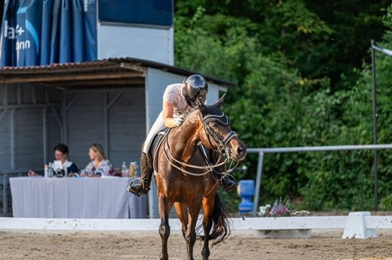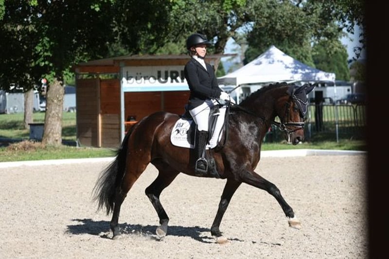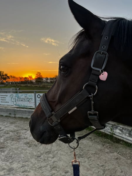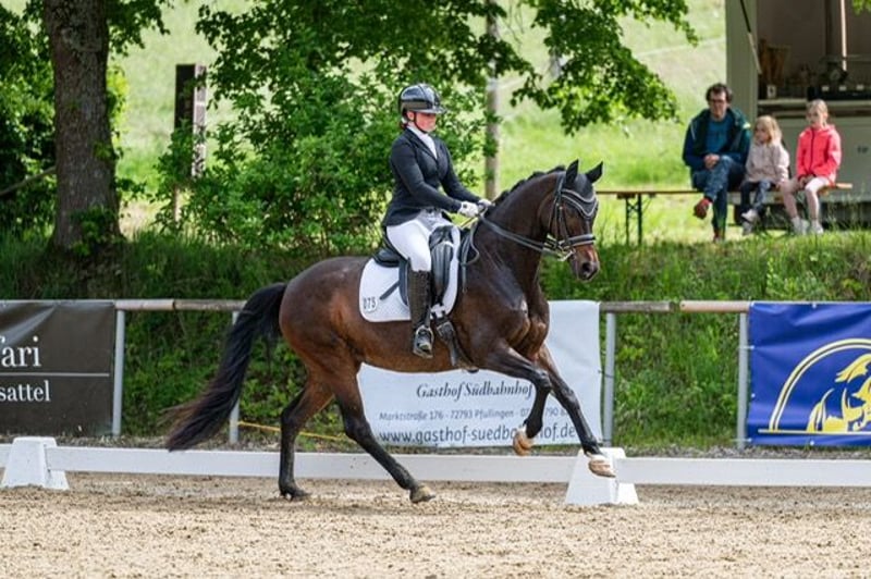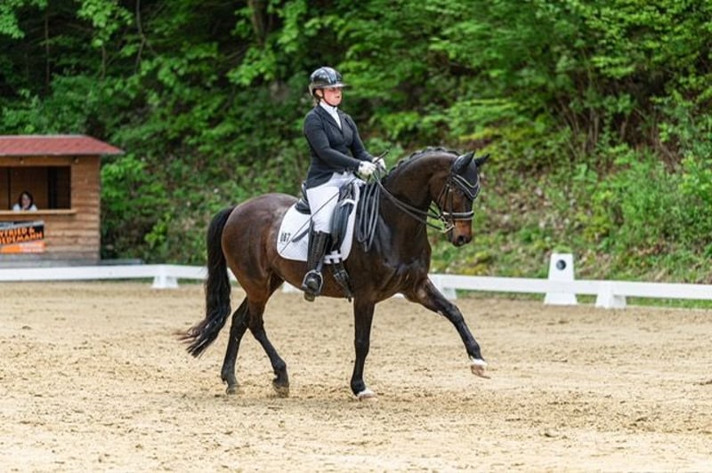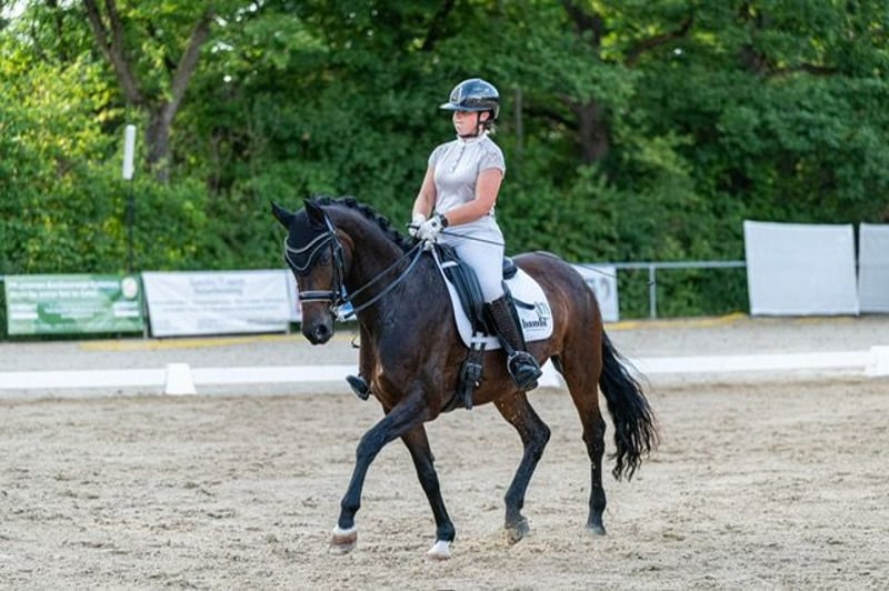 "Püppi" is a very charming, stylish mare with good basic gaits. She has been very successful in dressage sport with my daughter over the last few years. She is trained up to M** level, placed at M*, and has won L** with over 70%. She has also won several L dressage competitions with scores up to 8.2. In 2023, she was victorious in the state youth cup final U16 at L level. My daughter has worked on the first S-level tests with her this year. She is well-behaved in the field and also loves to do cavaletti work for a change. As my daughter is now in high school, we unfortunately have to part with some horses and are therefore looking for the right person. We can imagine our Püppi with a very good and especially sensitive riding teenager, as well as a parent-child duo or a not too large adult; she is not a weight carrier. She will only be given into the very best hands and in species-appropriate housing. There are no current veterinary checks or X-rays available, but these can be commissioned by the interested party. She is a very friendly mare, affectionate, and has a fighter's heart. She is fully vaccinated, well-behaved with the farrier and veterinarian. With us, she lives in a herd of mares and goes into her box at night. For a meet-and-greet and trial ride, a fee of 25 euros is immediately due in cash.