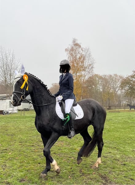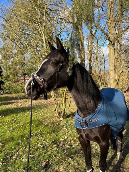Diese im Hengsttyp stehende 175cm Stockmaß große, bildhübsche Winterrappen Stute sucht ihr 5🌟 zu Hause. Sie liebt es gekuschelt, beschmust und betüdelt zu werden. Bodenarbeit meistert sie super und hat Spaß daran. Sie ist rein Dressur gezogen, geht natürlich auch über Stangen und Cavaletti. Ausgebildet ist sie bis A, geht auch Problemlos bis L. Was natürlich wieder mehr gefördert werden muss. Rose ist sehr sensibel an den Hilfengebungen. Daher auch nicht an reine Anfänger zu verkaufen. Sie will super gefallen und alles richtig machen, durch ihr Talent hinterfragt sie auch mal gerne ihre Reiter. Rose ist nie böse, bei uns in der Herde Ranghoch, aber eine sehr liebe Leitstute. (Zu lieb) Sie kennt Boxenhaltung, Offenstall und 24/7 Weidegang. Wir sind offen für alles, außer für reine Boxenhaltung. Das wäre nicht das richtige für sie. Rose ist FN eingetragen. Bislang war sie nur beim WB Turnier und Dressurwettbewerb A dabei, was ihr sehr gefallen hat und sie Super gemeistert hat. Selbst ein Fohlen könnte ich mir bei ihr gut vorstellen, da sie sehr aufmerksam und ein starkes Interesse, bei den Fohlen an den angrenzenden Weiden zeigt. Definitiv möchte ich sie nicht nur im Dressur Sport sehen, sondern auch mehr Freizeit mäßig. Könnte mir auch gut ein Mutter-Tochter- Gespann vorstellen. Nicht zu viel wechselnde Reiter. Sie geht gerne raus guckt sich alles an ist immer neugierig, interessiert. Einziges Manko der Hänger. Sie ging rauf nur macht es nicht gerne , dabei aber nie kopflos!! In den letzten Monaten haben wir auch nicht mehr geübt , was natürlich bei weiterer Übung, mit Liebe und auf Vertrauensbasis zu meistern ist. Uns ist wichtig das richtige Zuhause für sie zu finden , deswegen platz vor preis !! Hat sie Ihr Interesse geweckt? Dann kontaktieren Sie uns gerne! Wir freuen uns über eine kleine Vorstellung von Ihnen und Ihren Zukunftsvorstellungen mit unserer Rose. Um Reittourismus vorzubeugen wird eine Gebühr von 25 Euro verlangt, welche bei Kauf selbverständlich angerechnet wird. Wir freuen uns über ihre nachrichten !