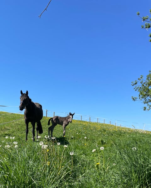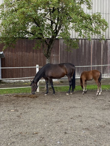 It is with a heavy heart that we are selling our mare, descended from Don Primus/Noble Roi, who is in foal to Expectation PS, having been covered in May 2025. She has already had 2 foals, in 2022 an SF by Foundation (see video) and a HF from this year 2025 by Expectation PS (see picture, black). Before her two foals, she competed successfully up to M level dressage, winning at L level. She is an excellent breeding mare, taking on well and making every breeder's heart beat faster with her wonderful and affectionate nature. She is farrier-friendly and easy to handle. If you are interested or need more information, we look forward to your message! We are looking forward to your inquiry! **Place before price** Please only inquiries for breeding.