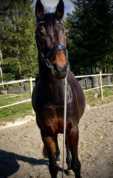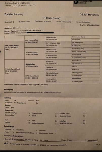 Con grande rammarico, vendiamo la nostra cavalla, discendente da Don Primus/Noble Roi. È in stato interessante, incinta di Expectation PS, con parto previsto per maggio 2025. Ha già avuto due puledri: nel 2022 un puledro da Foundation (vedi video) e nel 2025 un puledro da Expectation PS (vedi foto, castrone nero). Prima dei suoi due puledri, ha gareggiato con successo fino a livello M in dressage, fino a livello L. Si lascia prendere molto bene e rappresenta una cavalla da monta esemplare, capace di far battere il cuore di ogni allevatore, grazie alla sua personalità affettuosa e dolce. È abituata alla ferratura e al carico, ed è molto facile da gestire. Per interesse o ulteriori informazioni, saremo felici di ricevere il vostro messaggio! Attendiamo vostre richieste! **Priorità alla qualità, non al prezzo** Si prega di contattare solo per scopi di monta.