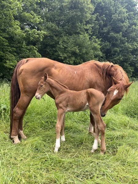 It is with a heavy heart that we part with our affectionate and proven broodmare Rubina, born in 2010. Rubina combines the outstanding bloodlines of Rotspon and Matcho AA and has already given us impressive offspring who are successful in dressage up to advanced level. Rubina is currently in foal to Vital Hit OLD, a talented dark chestnut stallion who impresses with his strong type, quality of movement and elegant appearance. Vital Hit OLD has quickly made a name for himself in dressage sport: 2022: Oldenburg State Champion of 3-year-old stallions; qualified for the Bundeschampionat with high scores in basic gaits and rideability. In 2022 he passed the short VA test and in January 2023 the sport test in Münster, both with scores well above 8.0. In 2023, he was victorious in novice class dressage tests for young horses with top scores (up to 8.7) and qualified for the World Championships for Young Dressage Horses in Ermelo, where he excelled in the small final with 84.2 %. Vital Hit OLD is descended from the renowned Vitalis, who became famous as the reserve winner of the NRW licensing and produced numerous licensed sons as well as champion stallions and Bundeschampions. His dam Loretta Live belongs to one of the world's most influential mare lines, as a full sister to Royal Hit and half-sister to the important stallions Diamond Hit and Sandro Hit. Rubina is an experienced, caring mother with a calm and balanced nature. Her bond with people and her excellent character make her an ideal broodmare and companion. Her previous foals by Vital Hit OLD have great dressage potential and also impress with their rideability and willingness to perform. Rubina offers a rare opportunity for ambitious breeders who value performance, quality and character. She will only be sold to experienced, loving hands. We look forward to hearing from you for further information and viewing appointments! E-mail: richard.tschrepp@gmail.com Whatsapp: 0049 162 2377375 Phone: 0049 160 5298297