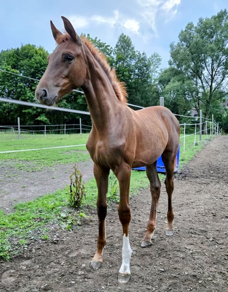 Na sprzedaż wystawiamy naszą obecnie 17-letnią klacz hodowlaną o wysokości około 170 cm, pochodzącą od: Sandro Hit x World Cup I x Absatz x Adorno Jej matka jest bezpośrednią pełną siostrą Weltmeyera. Przez cztery sezony hodowlane miała cztery źrebięta i zawsze od razu przy pierwszym zapłodnieniu przyjęła się bez problemu. Przekazuje się jako wysoka, długonoga, o mocnym typie i szlachetnym wyglądzie, z dobrymi podstawowymi ruchami. Niestety, pięć lat temu miała uraz, w wyniku którego zachowała jedno z nóg, które nieco się już nieco pogrubia. Nie sprawia jej to żadnych problemów i w przeszłości nie miała z tym żadnych trudności. W 2025 roku miała źrebię pod siodłem i od tego czasu nie była już zapładniana. W razie pytań prosimy o kontakt telefoniczny pod numerem: 0176/20119491