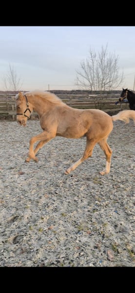 Due to unreliable buyers, she is back on the market. You learn from experience... Because of my pregnancy, I am willing to part with my young sporthorse. This is not a desperate sale! Elsa features a stunning palomino color combined with excellent genetics for show jumping and eventing. She is registered with the SCSL - Studbook du Cheval de Selle Luxembourgeois. She has top lines for jumping and eventing, with strong performance bloodlines and a solid dam line. Her sire is a young stallion from the renowned Muze stud farm. Her dam has shown free jumping in the Hanoverian main studbook, and her grandmother has achieved sport success. Elsa presents as a very correct and brave yearling, with plenty of power in the hindquarters and a harmonious conformation. She is energetic but very friendly. She stands quietly for grooming, tacking, and leading, and is easy to handle when it comes to hoof care, spraying, and touching all over. Very fearless. An ideal sport horse for an ambitious and experienced rider in eventing or show jumping. Her final height should be around 16.1 hh. She has been raised in a premium environment with high-quality feed, regular farrier visits, and daily turnout since birth. She can remain there if a suitable training or sales arrangement is desired. Price is negotiable, and I prioritize the horse’s sporting potential. I am open to significant concessions for qualified riders or trainers.