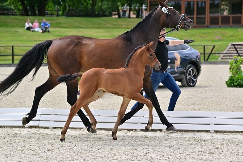 This fine filly is called Vanilla and is by Va Bene. Vanilla has great, athletic and ground covering gaits and is already very well balanced. Her character is very sensitive and attentive. She is therefore suitable for experienced horse people who want to shape their young horse themselves with patience. Very promising as a future dressage horse due to her exquisite pedigree, see below! From robust and sustainable top breeding with plenty of space and lots of pasture, i.e. with the best conditions for a long, healthy resilience. Optimally cared for, supplied with minerals, perfectly healthy, regularly wormed and regularly at the farrier. The sire of this pretty young lady is Va Bene (Zuchthof Wadenspanner). With impressive sporting successes and a promising future in the Grand Prix arena, he is one of the most popular stallions around. He passed a very good HLP (final score of 8.59), qualified for the Bundeschampionat and took part in the World Championships for Young Dressage Horses. Despite his moderate participation in competitions, he has already won two advanced (S) level dressage competitions at the age of 7. Even more important, however, is his heredity: Va Bene's foals are in great demand and the first sons have been licensed and awarded prizes. We expect Va Bene's excellent riding qualities and his very good balance to be passed on to this foal. The pedigree then leads via the valuable dam of Franziskus FRH into the high-performance, direct mare line of the Olympic and Grand Prix horse Elvis VA (Nadine Capellmann, team gold at the 2008 Olympic Games, team gold at the 2006 World Championships, team silver at the 2007 European Championships). Hanoverian mare line of Nagiaza, from which, among others: the licensed stallions Belong To Me (by Bonaparte N, 1.20m jumping, L-Dr, CCI3*), Calido's Son (by Calido, 1.35m jumping), Can't Stop The Feeling P (by Comme Il Faut), C-Mocca D'Or (by Monte Bellini, 1.35m jumping), Dark Cloud (by Dancier), Diaro Gin (by Diacontinus, 1.35m jumping), Don't Stop Me P (by Diacontinus, 1.35m jumping).), Don't Stop Me P (by Diamant de Plaisir), Edgar (by Espri, 1.30m jumping), Emotion B (by Emerald van 't Ruytershof (Emerald N.O.P.), 1.25m jumping), Frisantos (by Franziskus), Galino (by. Graf Grannus, 1.35m jumping), Garant (by Garibaldi II, 1.35m jumping), Glenn Miller (by Gardeulan I), Golfball (by Grenadier), Grand Ferdinand I (by Grande, 1.40m jumping), Grand Ferdinand II (by. Grande, LG Celle), Quidam Stakkato (by Quidamus, 1.35m jumping), Quintet (by Quintender, 1.45m jumping), Ratino (by Rousseau), Visano (by Van Gogh), Wyclef Jones (by Weltmeyer, L*-Dr.). the dressage horses: Callaho Socrates (by Stakkato, 1.10m jumping, PSG/Inter I), D.J. (by Del Piero, M*-Dr.), Don Laurus (by Donjour, PSG/Inter I), Duvalier (by Davignon I, M**-Dr.), Elvis VA (by Espri, Grand Prix), Felicity Romance (by. Fürst Romancier, M**-Dr.), Legolas (by Don Primero, M*-Dr.), Liander K (by Lingh, M*-Dr.), Principessa Dapolar (by Prinz Pilot, M*-Dr.), Quam Libet (by. Quaterback, Grand Prix), Quentin Tarantino, (by Quaterback, M*-Dr.), Saimir by Scolari (M*-Dr.), Salt Lake (by Stedinger (M*-Dr.), Scolari's Sixpack (by Scolari, PSG), Senor Pepe (by. Sir Donnerhall, PSG/Inter I), Simply Magic (by Stedinger PSG/Inter I), Stravinsky (by Stedinger, Grand Prix), Sun Dancer (by Scolari, S-Dr.), Whitney W (by Weltmeyer, M*-Dr.) as well as the show jumpers: Balouness (by Balou du Rouet, 1.50m jumping), Caja (by Cornet Obolensky, 1.50m jumping), Callaho Lord Cris (by Lord Z, 1.55m jumping), Carlosspri (by Carlo, 1.45m jumping), Catch me if you can (by Colway Bold xx, 1.40m jumping), Chacca Blue (by Chacco-Blue, 1.40m jumping.), Clausewitz (by Continue, 1.60m jumping), Cortney-Cox (by Carlo, 1.60m jumping), Curo (by Cornado I, 1.45m jumping), Czwerg (by Clinton, 1.40m jumping), Dolittle (by Dinard L, 1.40m jumping), Elegance (by Escudo II, 1.60m jumping), Graphit 41 (by Grenadier, 1.35m jumping, L**-Dr.), Little Esprit (by Espri, 1.45m jumping), Loyd (by Lord Caletto, 1.40m jumping), Severino P (by Sion, 1.45m jumping), Sierra (by Silvio I, 1.60m jumping), Suzi Quatro (by Stakkato, 1.40m jumping), Swedish Dynamite (by Callaho's Sampras, 1.45m jumping).