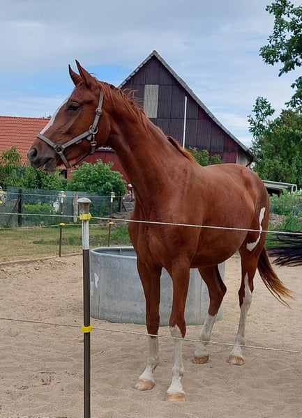 For sale, due to personal reasons, this striking mare. She is still completely untrained. Pedigree: Shu Fu x Dauphin Height approximately 1.70 m Fully vaccinated against tetanus, influenza, herpes, and West Nile virus. Feel free to come by and meet this people-oriented mare! Phone: 0160 2972603, WhatsApp is also possible.