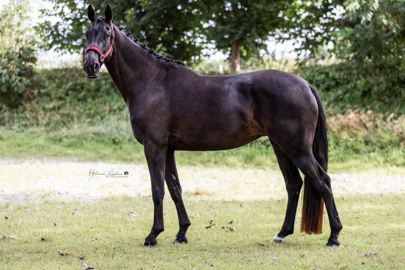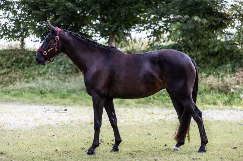 For sale is a talented 4-year-old Hanoverian mare with three good basic gaits, especially her canter is noteworthy. She presents herself in an elegant black coat and has a height of 162 cm. Having placed in riding competitions, she is still at the beginning of her training. She is familiar with groundwork including lateral movements, desensitization training, working equitation, and pole work. Her diverse training, willingness to learn, and openness to new experiences make her an ideal partner for ambitious riders. Due to her age, she is NOT a beginner horse and needs an experienced rider with a gentle hand. She is well-mannered, very people-oriented, and easy to handle. A current very good radiographic examination is available. Further videos will follow. If you are interested or have any questions, we are happy to assist!