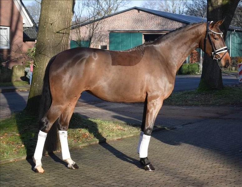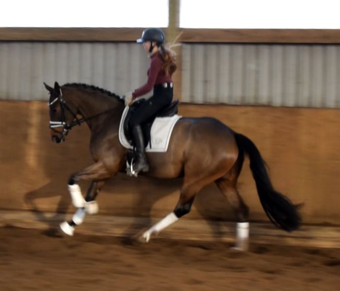 A rare find in a dancer! Beautiful, expressive mare equipped with a very ground-covering walk, an uphill canter, and a lively trot with highly active hind legs and willingness to collect. Vajana has an excellent character and is very easy to ride and eager to learn. She is a horse that can undoubtedly be trained wonderfully. She is perfectly suited for both demanding dressage sport and amateur riders. She is well-trained for her age and on the way to becoming a dressage horse at level A. Vajana is ridden both indoors and on the outdoor arena and always presents herself as very uncomplicated. Currently standing at 1.64 meters and still growing. Thanks to her very correct conformation and well-set neck, she appears larger under the rider and comfortably carries bigger riders. Trial rides are available at any time by arrangement. More information can be found on our homepage. Hof Heisterbusch Team