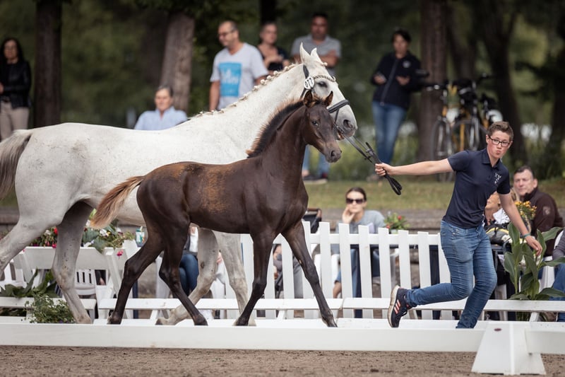 Preciosa yegua castaña oscura K.C. Can Fly por Conthargos de la yegua de salto K.C. Diana. Tamaño final esperado 170. nacida el 20.03.22. Prima de oro. K.C. Can Fly es una transferencia embrionaria, por lo que la yegua de las fotos no es la madre. La madre Diana esta colocada en salto M y actualmente en entrenamiento para salto de 150 cm. K.C. can Fly fue el campeón de los potros de salto en los campeonatos de potros de Wickrath. El veredicto del jurado: "No puede ser más bonita y mejor". Su hermana completa Carrera (yegua negra) también recibió la prima de oro en la exposición de potros de Wickrath el 9 de agosto (ambas yeguas son transferencias de embriones).