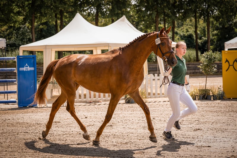 3 jährige springgewaltige Stute IA Prämie Staatsprämienanwärterin (als Fohlen Fohlenchampionesse/Goldprämie) Bildschöne Dunkelfuchsstute K.C. Can Fly von Conthargos aus der Springleistungsstute K.C. Diana. Voraussichtliches Endmass 170. Geb. 20.03.22. K.C. Can Fly ist ein Embryotransfer, sodaß die Stute auf dem Fotos nicht die Mutter ist. Die Mutter Diana ist im Springen M platziert und derzeit im Training fuer 150 cm springen. K.C. can Fly war auf dem Fohlenchampionat in Wickrath die Championesse der springbetonten Fohlen. Urteil der Jury: "Schöner und besser geht nicht mehr." Ihre Vollschwester Carrera (Rappstute) hat am 9.8. auf der Fohlenschau in Wickrath ebenfalls die Goldprämie erhalten (beide Stuten sind Embryotransfers). Anläßlich der Stutenleistungsprüfung inWickrath erhielt sie die IA Prämie mit Staatsprämienanwartschaft. CanFly kann nun auf die Turniersaison 2026 vorbereitet werden.