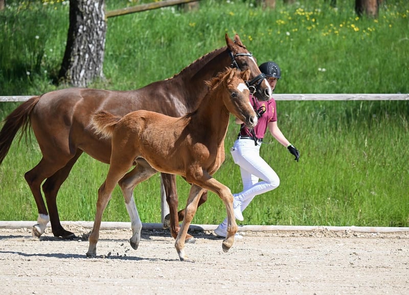 *Felicia* Diese wunderschöne Fuchsstute wurde im Jahr 2021 geboren und überzeugt durch ihr freundliches Wesen sowie ihre beeindruckende Erscheinung. Durch ihre raumgreifenden Grundgangarten und ihren motivierten Charakter bietet sie die perfekten Voraussetzungen für ambitionierte Reiterinnen und Reiter, die ihre Dressurkarriere vorantreiben möchten. Auch als Nachwuchspferd für Jugendliche wäre Felicia geeignet. Sie wird der Zuchtlinie entsprechend im Dressursport ausgebildet und zeigt bereits viel Talent. Bei einem Freilaufcup konnte sich Felicia den zweiten Platz sichern, bei ihrem ersten Turnier (Reitpferdeprüfung 2025) wurde sie dritte und somit platziert. Ihre angenehme Art macht sie zu einer zuverlässigen Partnerin im täglichen Training und bei Turnieren. Neben der Eignung als Sportpferd, ist Felicia zudem Interessant für die Zucht. Bei der Stutleistungsprüfung erlangte sie eine Gesamtnote von 8,22 und schenkte uns 2025 Jahr ein prämiertes Stutfohlen von Va Bene (siehe letzten beiden Fotos und Video). Die Stute ist gesund, regelmäßig geimpft und frei von Krankheiten. Sie ist gut im Umgang und lässt sich problemlos bei Tierarzt, Schmied und Zahnarzt vorstellen. Ein TÜV liegt aktuell nicht vor. Bei Interesse stehe ich gerne für weitere Informationen zur Verfügung. Ein Probereiten ist nach Vereinbarung möglich. Gerne per WhatsApp unter +4915560581906.