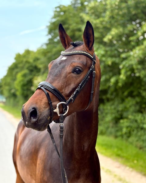 Excellent training horse for the ambitious leisure rider. Fancy was given plenty of time to grow into her body at four years old, so she is still quite green for her age of five and lacks a bit of strength, but this is being professionally worked on every day. She is always very motivated during work, and her consistently active hind leg as well as her regular, calm walk are certainly worth mentioning. She learns new movements quickly and is easy to handle, also very affectionate. Despite her size, she is not yet suitable as a children's horse; she needs a rider who can provide her with confidence and help her solidify her basics. Good TÜV X-ray images of her neck and back are available from early 2024. If interested, we are happy to provide videos and additional photos.