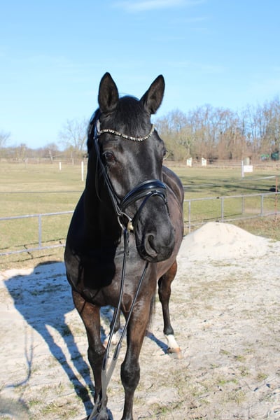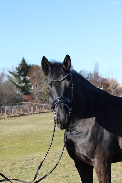 Elegant Hanoverian mare for sale – perfect for dressage! This beautiful dark mare was foaled in 2021 at Klostergut and impresses with her striking appearance and promising potential. Standing at 16.1 hh, she offers an ideal size for ambitious riders looking to progress in dressage. She has a strong character, is eager to learn, and possesses an excellent basic training. Her elegant appearance and pleasant temperament make her an ideal partner for the dedicated dressage rider. Please feel free to contact me for more information or to arrange a viewing.
