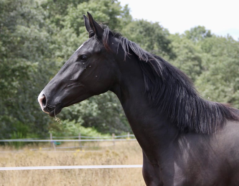 5-year-old mare with prestigious dressage bloodlines by Fürst Toto x Negro. She was injured at the age of 2, which compromised her sporting potential, so she is offered for breeding purposes. She has three very beautiful gaits, a very good temperament, and is very people-oriented and easy to handle.